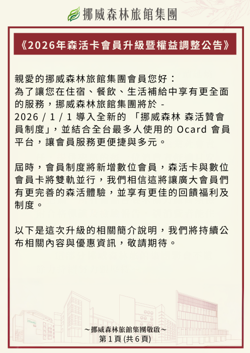 挪威森林旅館集團|2026年森活卡會員升級暨權益調整公告